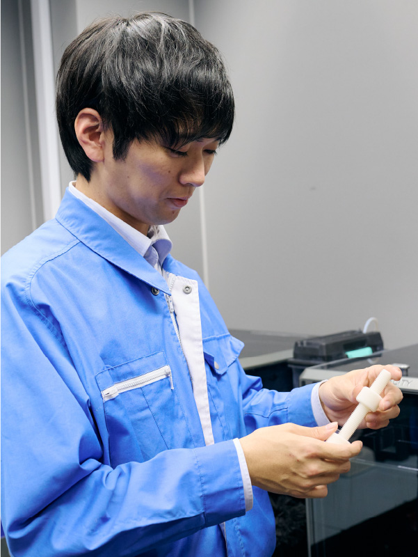 新製品の開発・設計を⾏う部署である製品開発部に所属し、開発業務に携わっています。そのほかの業務としては、お客様から委託を受けて行う研究やシミュレーション、新技術の検討として行う3Dプリンターの管理などがあります。