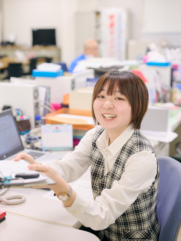 総務部では社内のさまざまな依頼に応えるのですが、それにプラスして「こんなふうにしたら相手にとってわかりやすいだろうな」というように考えて動くことにやりがいを感じています。毎年創⽴記念式典に配るお菓子を決める業務では、アイデアを募ったり⾃分で考えたりしながら実際に試⾷を⾏って決めるのがすごく楽しいです。当社の好きなところは社内の皆さんが優しいところです。総務部の皆さんも穏やかな⽅ばかりですし、役員の皆さんもよく気にかけてくださいます。