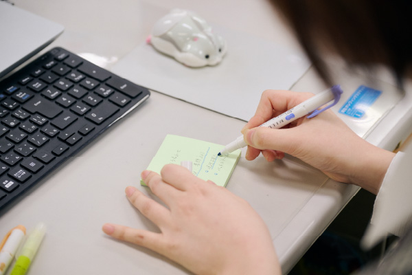 仕事をする上での必需品は、付箋とマーカーです。付箋は、仕事中、本当によく使います。書類を回すときのメモ書きや、自分の業務の整理ために使ったりしています。それもあって、これが一番身近かなと思って選びました。マーカーは書類や郵送物を回すときにチェックをよくします。場面によって色分けしたりして使っていますので、付箋と同様に身近なものとして選びました。